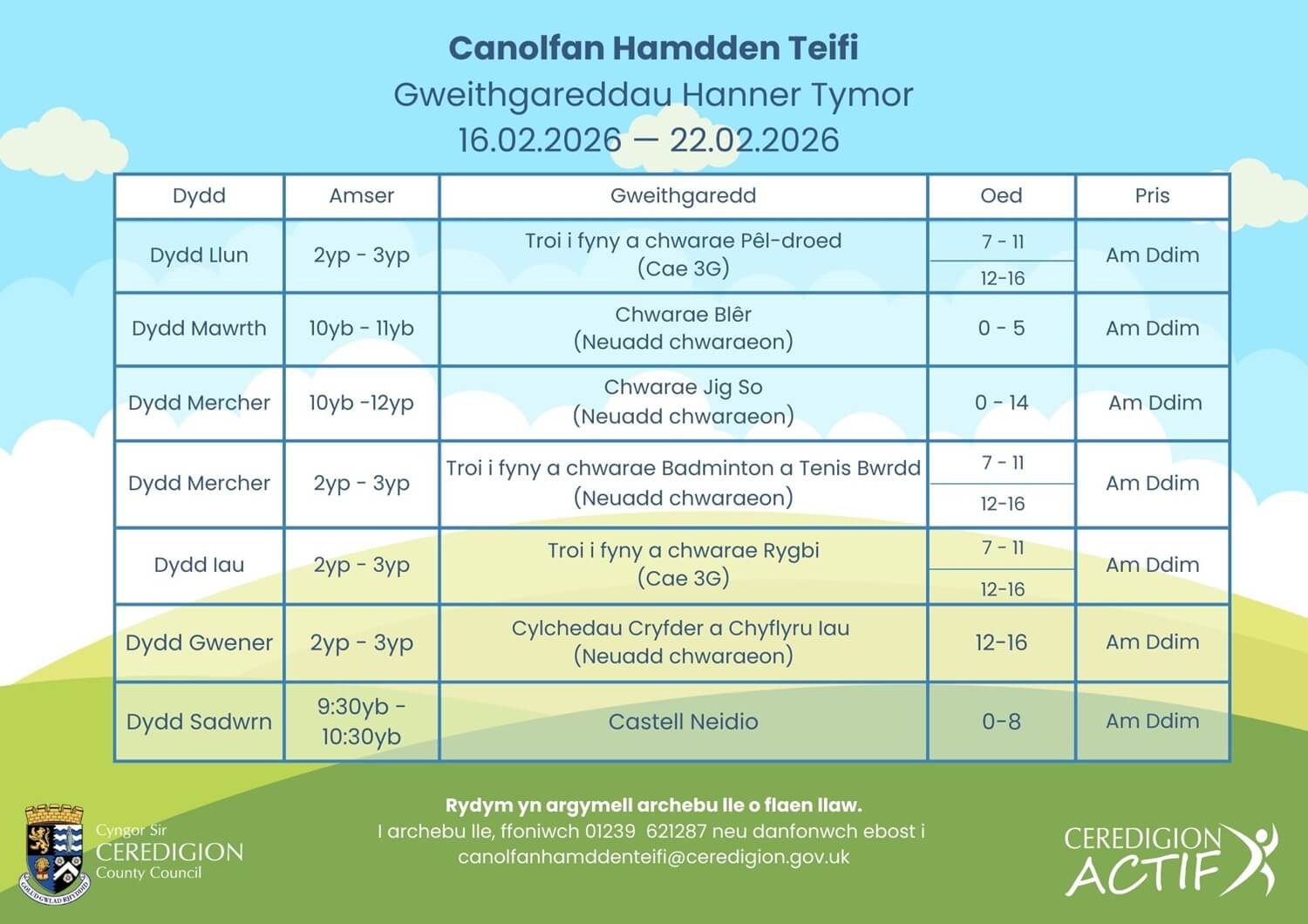 | Dydd Mercher | 08.00 - 09.00 10.00 - 21.00 |