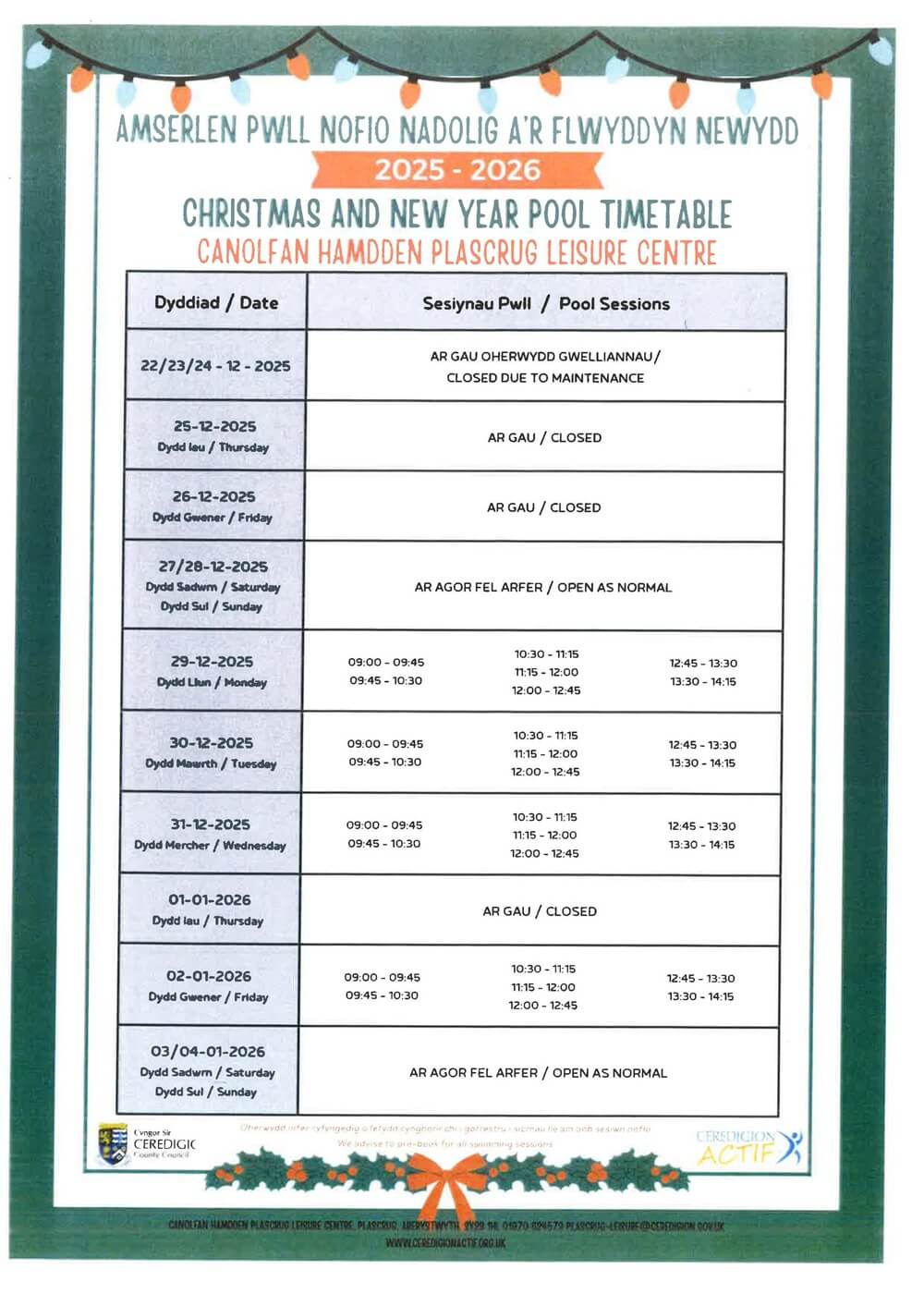 Yn ystod mis Rhagfyr bydd y pyllau nofio ar ystafelloedd ffitrwydd ar gau am gyfnodau er mwyn gwneud gwelliannau i'r cyfleusterau. Ymddiheirwn ymlaen llaw am unrhyw angyhfleuster achoswyd.